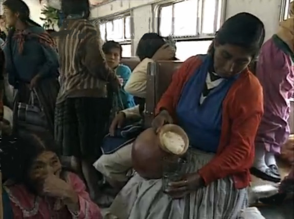 A venda destes refrescos é feita num balde de metal, com uma pedra de gelo boiando dentro de uma espécie de sumo, sendo mexido pela mão do vendedor de vez em quando, servindo os fregueses com uma concha e utilizando um saquinho de plástico como copo…é o que há, gente! Penso para os meus botões…Bien venidos a Bolívia!
